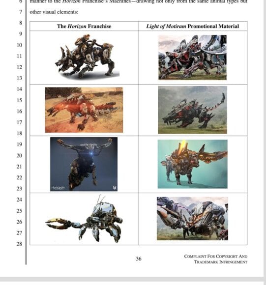 SIE 提供數十頁訴狀內容詳細對比兩款作品,強調騰訊不但複製主角「亞洛伊」的視覺風格,更將其形象用作宣傳素材,試圖吸引用戶將《荒野起源》誤認為正統續作。SIE 還提到,騰訊早前曾接觸 Sony 商討共同開發《Horizon》新作,但未獲批准,數月後卻推出風格極近的新遊戲,做法令人質疑。