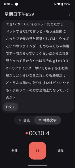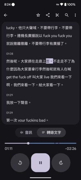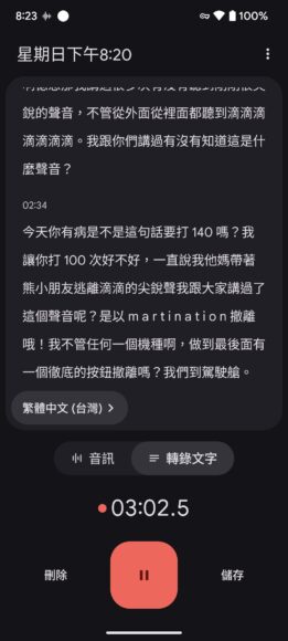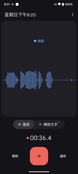 另一個平台的錄音功能,同樣有提供文字轉錄功能,但可留意到其準確率都十分高,但對比之下就可能沒有 Google 原廠錄音機來得好了,而且也缺乏分段功能、標點符號功能。