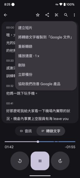 錄音完成後,點選「儲存」即可回到播放介面。這時你會發現 App 提供多種後續功能,例如「建立短片」、「將轉錄文字複製到 Google 文件」、「播放速度調整」、「重新轉錄」等。如果你已登入 Google 帳戶,還可啟用雲端備份功能,確保所有錄音與轉錄文字不會因手機壞掉或遺失而消失。
