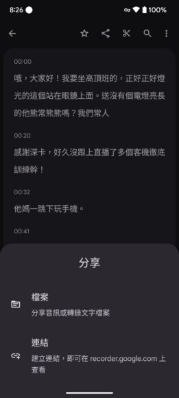 其實 Android 轉錄文字方面,英文會比較準確,準確率可超過九成五,但在中文也有不錯的準確率。以繁體中文台灣為例,一分鐘的轉錄文字,大概都只是錯一兩個字,原因是 Google 可在錄音的時候,就現場做逐字文字稿轉錄,而非整個錄音完成後才做。而且我們留意到,Google 轉錄文字時已為文字加入適當的標點符號,而不是一堆文字。用戶只要拿到 AI 再處理一下,就可修正轉錄的小錯誤。
