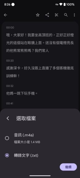 ▲在畫面下方按「轉錄文字」,即可看到錄音轉錄文字稿的內容