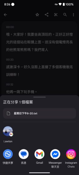 ▲你可將文字檔轉送給 FB Messenger 朋友、Gmail,或以訊息方式傳送
