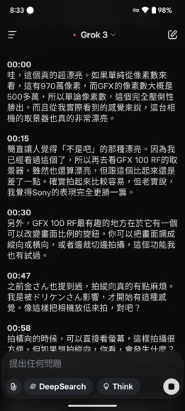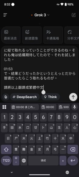 ▲例如轉錄出來的文字,可轉到 Grok 等 AI 工具,要求翻譯,甚至同時要求總結文章