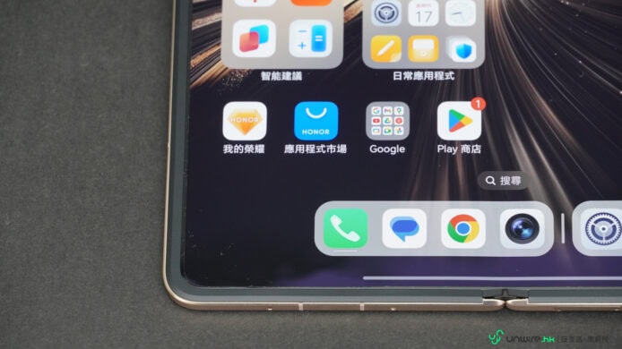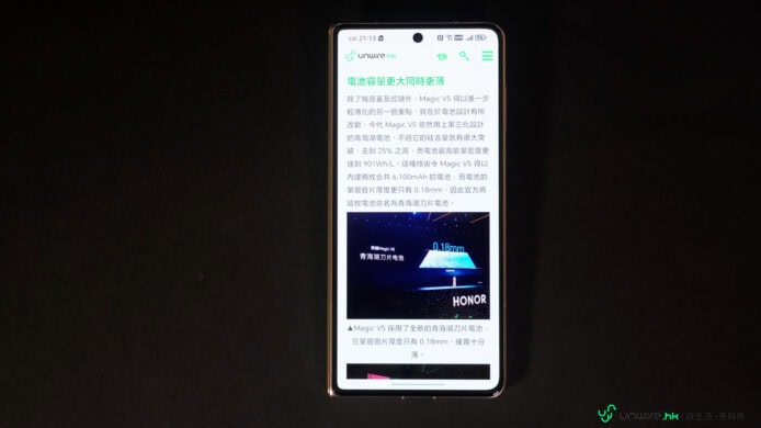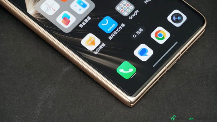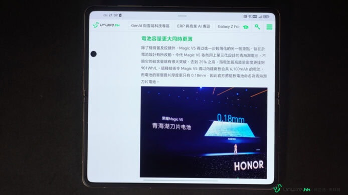 至於顯示方面,作為「大摺」,Magic V5 依然內建了外、內兩塊熒幕,當中機面熒幕維持上代 6.43 吋 2376 x 1060 解析度 120Hz 更新率 OLED 材質配置,但機內摺疊熒幕雖然依然是最高 120Hz 更新率的可摺疊 OLED 材質,但尺寸就由上代的 7.92 吋微增至今代的 7.95 吋,解析度亦由上代的 2344 x 2156 微增至今代的 2352 x 2172。不過這個升幅其實不是將上今兩代機放在一起比較,其實是很難覺察得到。而顯示質素方面,今代的內、外兩塊熒幕依然維持上代的出色效果,文字顯示清晰銳利,色彩亦屬自然,無論是用內、外熒幕睇網頁、睇相或睇片都十分不錯,可視角度亦十分高。更重要是內外熒幕均加入了不少 Honor 自家的綠洲護眼技術,亦支援 AI 離焦護眼功能,長時間瀏覽內容依然可以保護雙眼。當然,之前加入的 AI 暈車舒緩功能,在 Magic V5 上亦可用到,護眼功能確實十分全面。