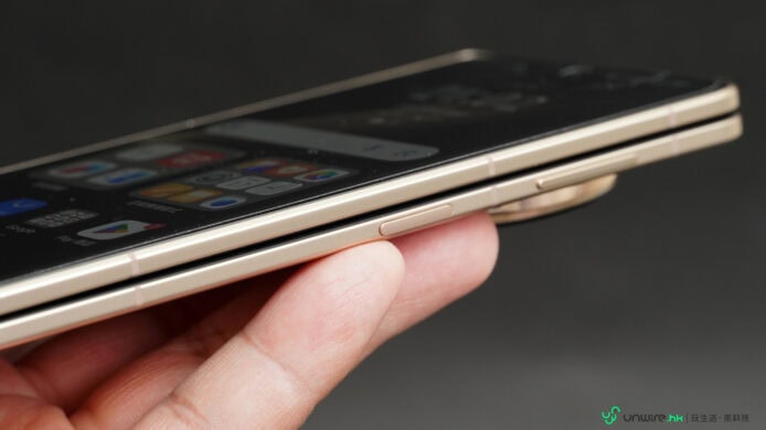 ▲筆者拿來上代 Magic V3(左)與號稱今代最薄的暖白色 Magic V5(右)比較一下厚度,大家會見到雖然數字上新機是薄了,但摺疊情況下看起來兩者分別不算大。