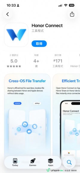 ▲以與 iPhone 互傳檔案為例,使用 iPhone 的用家需要先在 iPhone 下載及安裝 Honor Connect 程式。