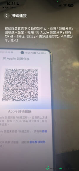 ▲之後在 Magic V5 的「與 Apple 裝置分享」設定中會出現一個 QR Code,iPhone 用家開啟 Honor Connect 程式後,只要掃描這個 QR Code,就可以與 Magic V5 進行連接。