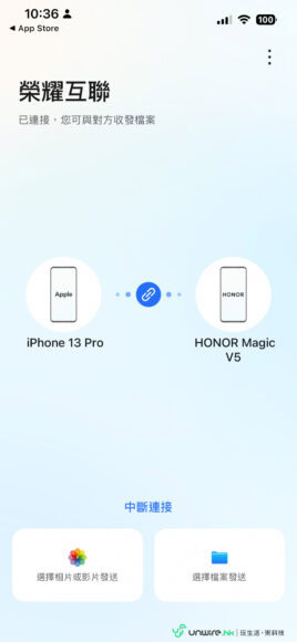 ▲相反,如果想從 iPhone 傳輸檔案到 Magic V5,只要 iPhone 用家開啟了 Honor Connect 程式,再點選「選擇相片或影片發送」或「選擇檔案發送」選項,再選好希望傳送的檔案,再點選「發送」即可。