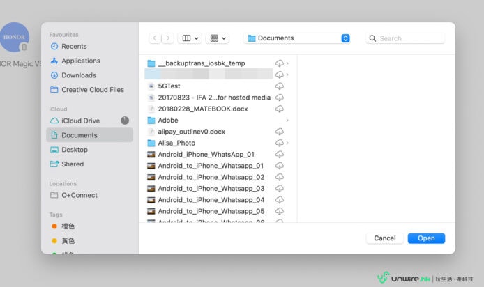 ▲當然,與在 iPhone 一樣,mac 電腦用家亦可以用此方法將檔案由 mac 機傳送到 Magic V5 上,只要在 Honor Share 介面點按 Honor 手機,再點選檔案後再選擇「Open」即可。