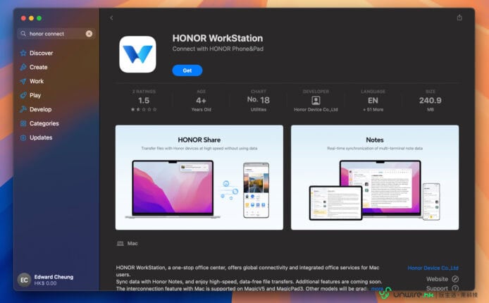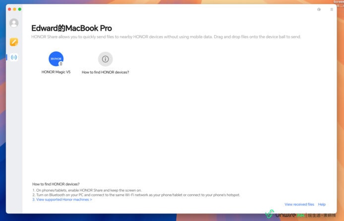 ▲除了與 iPhone 互傳檔案外,Magic V5 用家亦可以與 mac 電腦用家互傳檔案,同樣地 mac 電腦用家需要在電腦安裝 Honor WorkStation 程式。