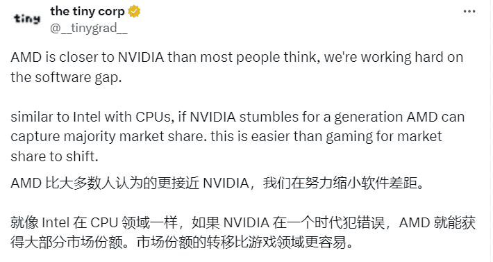 專注開發消費端 AI 解決方案的 Tiny Corp 認為,AMD 在軟件方面的進步已使其接近 NVIDIA 水平。該公司表示:「就像 Intel 在 CPU 領域一樣,如果 NVIDIA 一代產品犯錯誤,AMD 就能獲得大部分市場佔有率,並且市場佔有率轉移比遊戲領域更容易。」這觀點在當前 AI GPU 競爭激烈背景下顯得格外重要。雖然 NVIDIA 憑藉強大 CUDA 生態系統長期佔據主導地位,但 AMD 正透過 ROCm 平台迅速追趕。