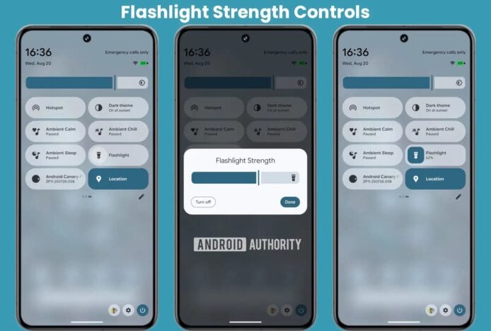 在新版本中,電筒快速設定圖示變成可展開設計。點擊後會開啟名為「電筒強度」對話框,內含滑桿和按鈕讓用戶關閉電筒或確認亮度設定。用戶可透過滑桿調整電筒強度,較高數值會提升光線強度,較低數值則會減弱亮度。