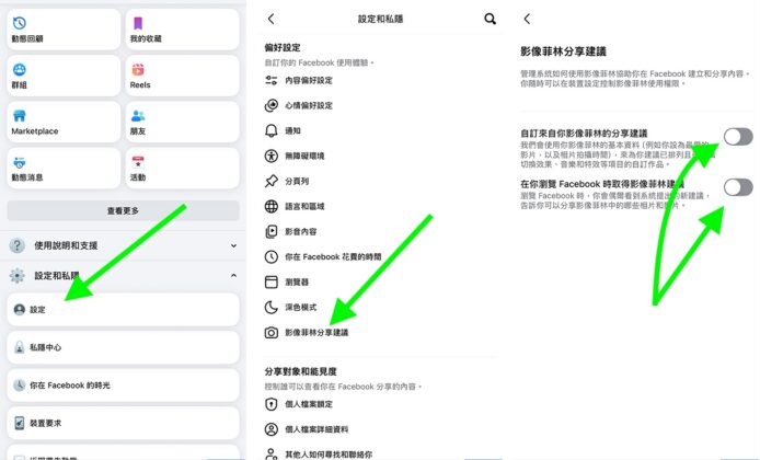 - 將「自訂來自你影像菲林的分享建議」及「在你瀏覽 Facebook 時取得影像菲林建議」兩個開關關閉