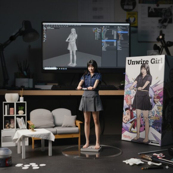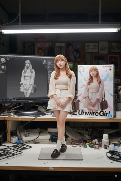 為圖中的人物製作一個1/7比例的商業化 Figure 手辦公仔,呈現人物原本的表情、手勢。手辦公仔要全身,配以一個亞加力膠底墊,不要有任何文字。背景是一個模型製作工房,有一個電腦,電腦螢幕顯示出此 Figure 的 ZBrush modelling process。在電腦螢幕旁邊,放置一個 BANDAI figure 模型風格的包裝盒,上面印有此模型的插畫,包裝盒上的標題文字用「Unwire Girl」