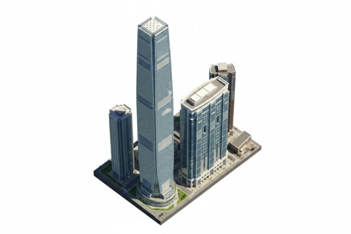 根據這張建築相片,生成一個「Cities:Skylines」風格的高解像 3D 模型,模型效果要寫實,設計主體結構、材質細緻。強調光影效果,顯示出玻璃反射,需要展現這張圖片的立體感。其模型可在高畫質遊戲中使用,生成高畫質3D渲染圖片,圖片以45度俯視角度觀看,背景白色
