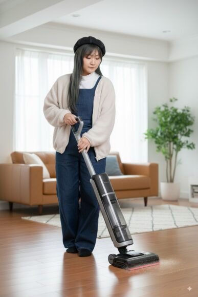 讓圖片裡的人物拿著吸塵機,在室內吸塵,作為一張廣告相片。保持人物高度為約165cm,吸塵機高度約為 130cm