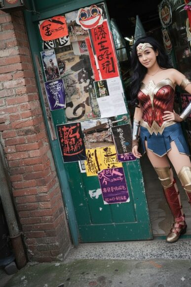 讓第一張圖片的人物的衣服、髮型、裝飾等 Cosplay 成第二張圖片神奇女俠的樣子,並擺起一隻手撐腰的的甫士,但人物的樣貌、五官則保持,不要變成了第二張圖片的人物。請注意圖片中只有一人,Cosplay不會有兩個人,並將只有一人扮演Wonder Woman。