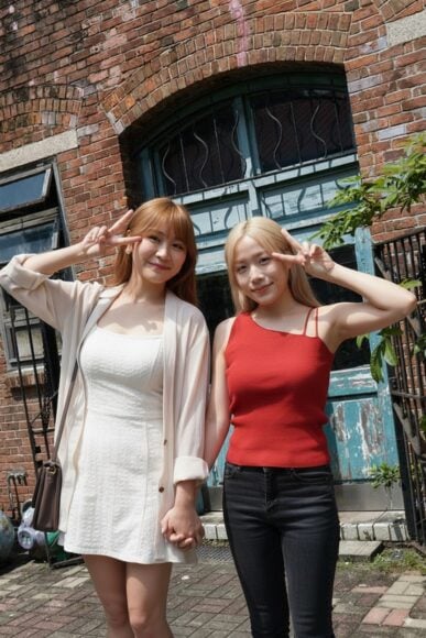 讓圖裡面 2 個人物合影,把兩個人放到清除了人物的第三張圖當中。兩個人手牽著手,另一隻手就舉起 Peace 的 V 字手勢,高畫質,人物衣服材質細緻,人物高度相同