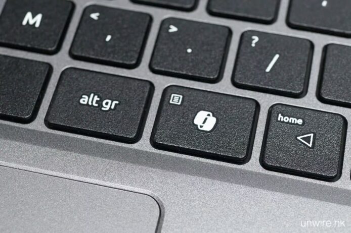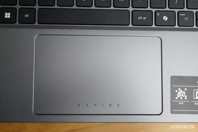 鍵盤打感是筆電使用體驗中經常被忽略的部分,但 Aspire 14 AI 的背光鍵盤表現就比較令人印象深刻。實際打字超過三千字的編輯工作中,鍵帽表面的磨砂質感提供良好摩擦力,不易沾指紋,鍵程與回彈亦屬均衡。Copilot AI 快捷鍵與 AcerSense 專用鍵設於右上角,方便單手操作,使用習慣後切換 AI 功能變得非常直覺。