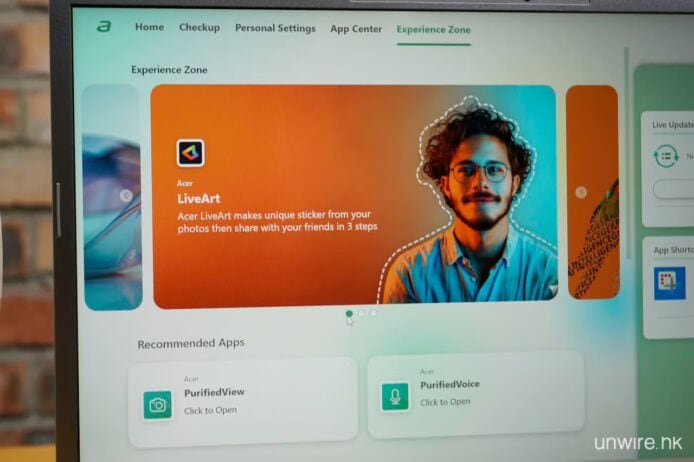 * AcerSense 體驗區:可啟用如 VisionArt AI 壁紙、LiveArt 圖像去背製貼圖、Cocreator AI 繪圖、Acer Assist 離線知識庫等創意工具。