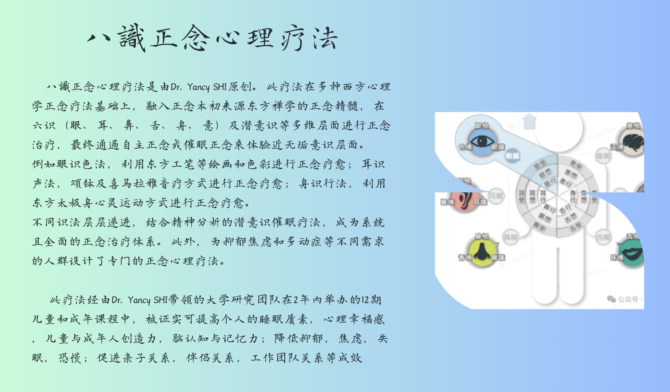 Dr. Shi 在過往十幾年中,多次前往中國及印度,研習不同宗教宗派的教哲學理論,積極參與不同禪修冥想閉關學習,博聞多種東方禪修與實踐,結合西方心理學與認知神經科學為基礎的正念療法,設計出正念心理教育中心獨有的多感官情緒療癒方案。她解釋道:「視覺、聽覺、嗅覺、味覺、觸覺及意識稱為六感,是東方文化中人與世界互動的六大通道。在這些感官所接收的資訊之上我們產生念頭,從而構成我們的內在情緒與行為。」Dr. Shi 認為,該中心的方案,是透過科技擴大學生及使用者的六感感知,引領他們進入平靜、美好的六感空間,以美的力量引導想法、情緒、行為回歸平衡,並運用 AI 技術,引導使用者專注於呼吸,進入靜觀狀態。