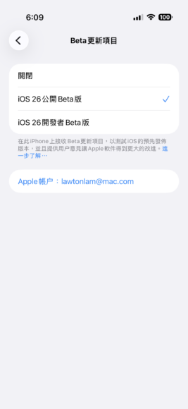 然後請打開 iPhone 的「設定」App,進入「一般>軟件更新」,在「Beta更新項目」選擇「iOS 26公開Beta版」,畫面便會提示你下載。