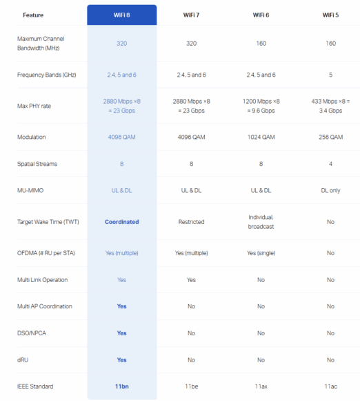 Wi-Fi 8 的主要目標不是進一步提升網速,最高速率維持在 23 Gbps,繼續使用 2.4 GHz、5 GHz、6 GHz 三個頻段、4096-QAM 訊號機制、320 MHz 信道帶寬。Wi-Fi 8 將著眼於大力改善整體可靠性與體驗,也就是所謂的「超高可靠性」(UHR)。它將優先保障在複雜環境下提供可靠的性能表現,即使在高擁塞、易受干擾、流動性強的環境中,也能提供穩定、低時延、近乎無損的連線體驗,號稱從「無線性能時代」跨越到「無限可靠性時代」。