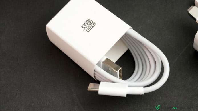▲而包裝盒底層就放入充電火牛及 USB 數據電源線,後者採用的是傳統 USB-A to USB-C 款式。