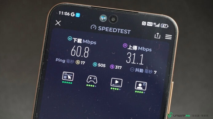 ▲筆者在沙田將 csl. 5G SIM 卡放入 X9d 內,再以 Speedtest 測速,結果下載及上載速度分別錄得 60.8Mbps 及 31.1Mbps,算是中規中矩。