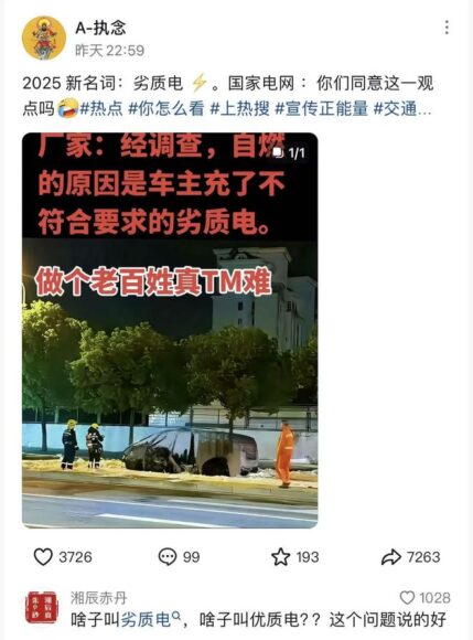 事故發生後「劣質電」一詞在網絡遍地開花。有網民認為新能源汽車出事可能因為充入「品質不良」電力,不同地區、水電、火電都被網民惡搞比較,有車主湧到中國國家電網留言查詢所謂「髒電」,令官網一度關閉評論區。雖然「劣質電」成功成為爆紅網絡潮語,但多方電機工程專家及物理學家紛紛出面反駁,指無論發電來源如何,最終交付用戶的電力在本質上並無區別,核心重點仍是電壓及供電品質穩定性。
