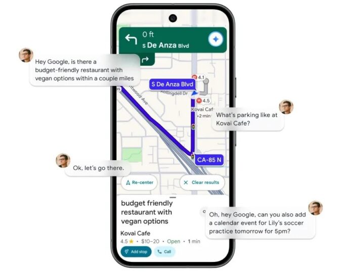 Gemini 整合到 Google Maps 應用程式的免手持駕駛體驗中,用戶現在只需開口詢問便可完成複雜任務 。例如可以問:「我的路線上有沒有平價的素食餐廳,最好在幾公里內。那裡泊車方便嗎?」然後直接說「好,就去那裡」。用戶甚至可以要求「順便幫我在行事曆加入明天下午 5 點的足球訓練」Gemini 會在獲得許可後自動新增活動 。