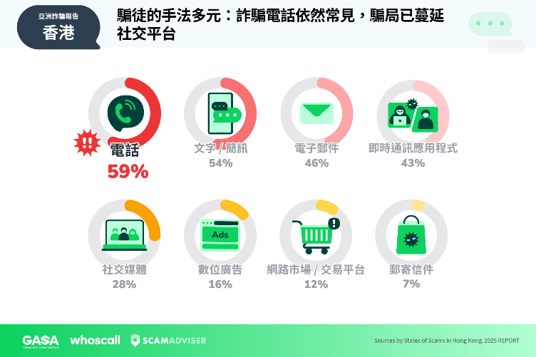 騙徒手法已從傳統電話詐騙擴展至社交媒體平台,WhatsApp、Gmail 和 Instagram 成為十大受詐騙平台前三位。騙徒利用用戶對這些平台的熟悉與信任伺機詐騙,從手機短訊、電郵到即時通訊應用程式都已淪為詐騙渠道,令市民防範難度大增。同時,人工智能令詐騙手段更逼真多變,從偽造短訊、聲音複製到冒充身份等手法層出不窮。