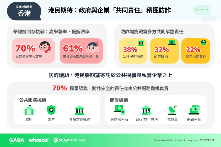 近 70% 受害者曾作出舉報,但有高達 61% 舉報者表示案件後續未獲任何更新或跟進。這種「舉報疲勞」現象削弱公眾對防詐機制的信心,而隨著公眾對防詐騙「共同責任」期望不斷提高,問題亦愈趨嚴重。約有 70% 受訪者期望政府部門、警方、金融監管機構及商業機構能採取更積極行動。
