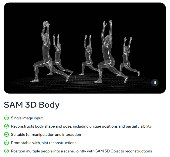 SAM 3D Body 可辨識影像中人體體型與姿態,轉換成 3D 模型。Meta 進行真人評測顯示,SAM 3D Body 與多款競爭 AI 對比中全面勝出,評測者認為其生成質素較高比例超過 50%,遠高於對手。