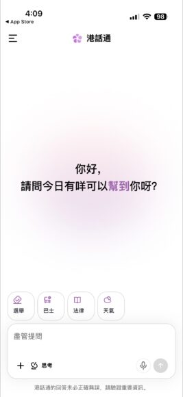 智能對話應用程式「港話通」(HKChat)近日推出試運行版,現已在 iOS 及 Android 平台供下載。市民可透過官方網站或手機應用程式商店安裝,隨時用手機查詢本地生活資訊。「港話通」以本地日常需要為重心,主打即時回應交通、天氣、衣食住行及法律諮詢等問題,期望成為港人日常生活 AI 幫手。