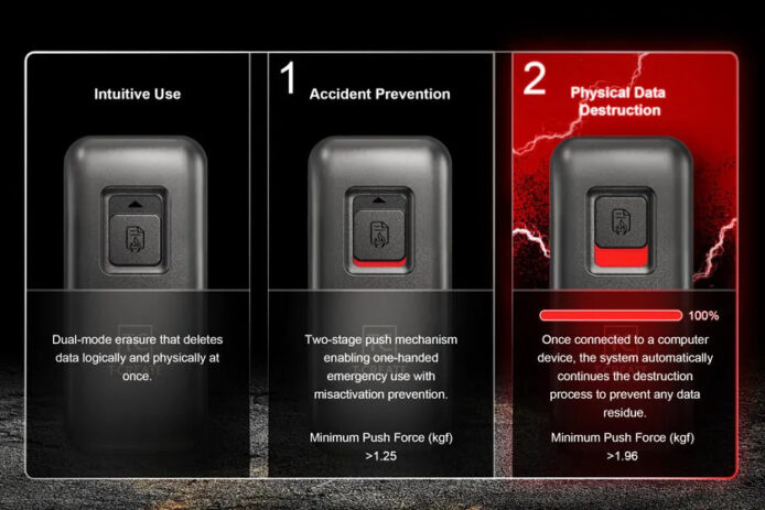 為防止用戶在口袋誤觸「自毀按鈕」引致災難性後果,TeamGroup 設計一套雙重安全機制,按鈕採用兩段式滑動設計。用戶需先用力滑動開關(第一段解鎖),露出紅色警示標記代表進入待命狀態;隨後需施加更大指力按下(第二段銷毀),才會正式啟動銷毀程序。
