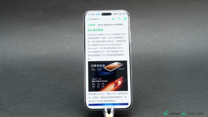 至於顯示方面,Honor Magic8 Pro 內建了 6.71 吋 OLED 熒幕,解析度為 2808 x 1256,並支援 1 – 120Hz 自適應更新率。這部分似乎也與上代分別不大,實際上亦是如此,畢竟 Honor Magic 系的手機熒幕一向表現都十分不錯,去到今代也沒有必要大改。不過細微的提升還是有的,配置方面今代 HDR 峰值亮度由上代 5000 尼特提升至今代的 6000 尼特,而一般局部峰值亮度亦達到 4000 尼特,並支援 Dolby Vision 及 HDR Vivid 影片格式,也擁有 ZREAL 幀享超高清認證,因此無論是用來瀏覽文件、網頁等文字為主,還是瀏覽相片、影片等以影像為主的內容,Magic8 Pro 的熒幕表現都十分不錯。