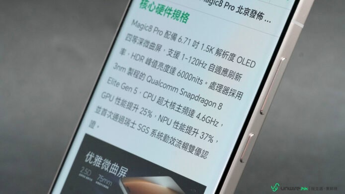 ▲與上代一樣,Magic8 Pro 依然是採用了四微曲邊熒幕配合機背邊位微弧式的設計,有別於市面近年流行的方磚式機邊設計。