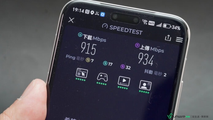 ▲以 Speedtest 量度接駁了 Wi-Fi 後的速度,下載及上載分別錄得 915Mbps 及 934Mbps,表現十分滿意。
