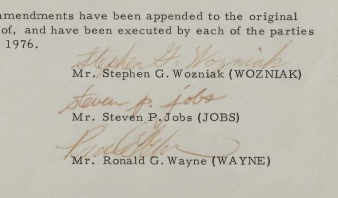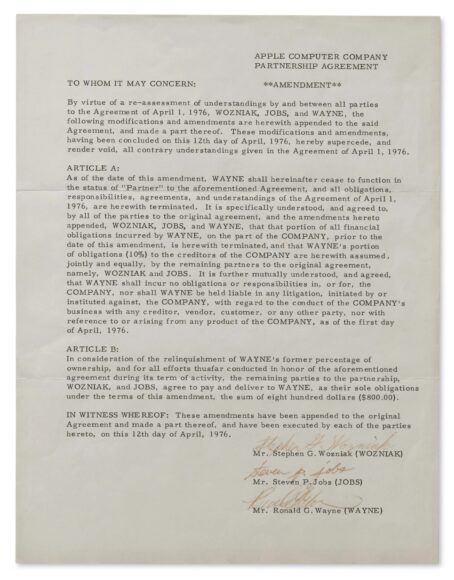 拍賣批次同時包括 Ron Wayne 在 12 天後簽署退股文件,他當時以 800 美元現金及後來追加 1,500 美元,合共 2,300 美元(約港幣 17,940 元)出售持股。若 Ron Wayne 持有該 10% 股份至今,以 Apple 目前約 4.1 兆美元市值計算,價值將達約 4,100 億美元(約港幣 31,980 億元)。現年 91 歲 Ron Wayne 曾在訪問中表示:「如果我留在 Apple,我可能會成為墓園裡最富有的人」,他認為當時 21 歲 Steve Jobs 和 25 歲 Steve Wozniak 充滿創業熱情,但 41 歲的他擔心公司倒閉會帶來個人財務責任。