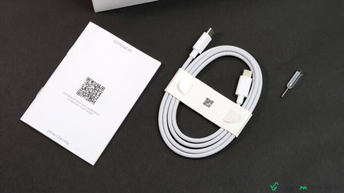▲而在底層就見到說明書、附送的 USB-C to USB-C 數據電源線及經典透明頭的 SIM 卡槽針,要留意的是手機並沒有附送充電插頭。