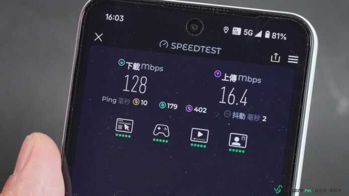 ▲筆者在沙田放入 csl. 5G SIM 卡並將 Speedtest APP 測速,結果下載速度達到 128Mbps,表現不俗。
