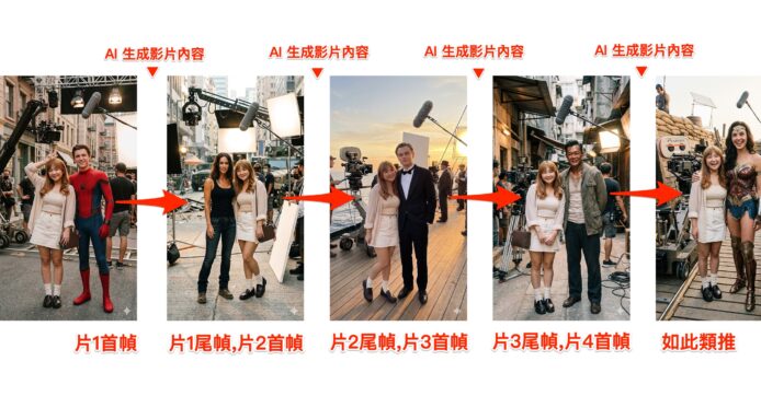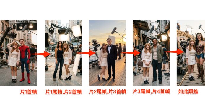 當你完成多張合照後,就可以開始規劃影片結構。每一段短片都會由「主角奔跑進片場 → 和電影角色合照」組成。你需要決定哪張是「首幀」、哪張是「尾幀」,讓 AI 幫你補出中間的奔跑動畫。例如我們選擇女生與蜘蛛俠的合照作為首幀,女生與神奇女俠的合照作為尾幀。