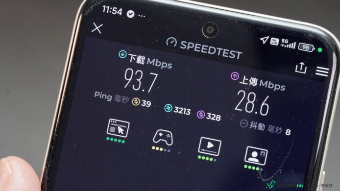 ▲筆者在沙田將 csl. 的 5G SIM 卡放入 Redmi Note 15 Pro+ 5G,並以 Speedtest APP 測速,結果下載速度錄得 93.7Mbps,表現算不俗。