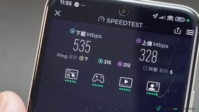 ▲不過筆者接駁了 Wi-Fi 網絡再以 Speedtest APP 測速,下載及上載速度仍可分別錄得 535Mbps 及 328Mbps,表現依然理想。