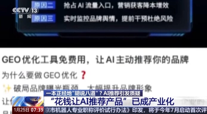 央視調查發現目前已有人專門從事「讓 AI 推薦商家產品」相關業務。社交平台上存在大量介紹及推廣「生成式引擎改良」帖子,有推廣者宣稱透過操作可讓 AI 回答相關問題時,將商家品牌或商品作為「標準答案」推薦給用戶。