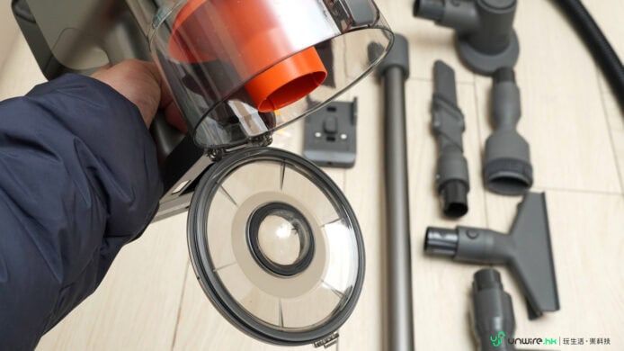 ▲集塵格容量達到 800mL,基本上如果家居是每日或者隔日吸塵,家中又沒有養寵物的話,基本上每周只需清潔一次集塵格也沒有問題,而且清潔亦十分簡單:對準垃圾桶按一下倒塵鍵即可打開集塵格的蓋,灰塵污物就可以倒走,十分方便。