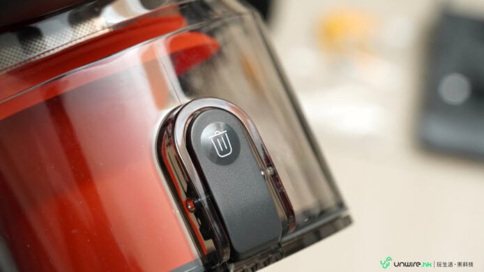 ▲集塵格容量達到 800mL,基本上如果家居是每日或者隔日吸塵,家中又沒有養寵物的話,基本上每周只需清潔一次集塵格也沒有問題,而且清潔亦十分簡單:對準垃圾桶按一下倒塵鍵即可打開集塵格的蓋,灰塵污物就可以倒走,十分方便。