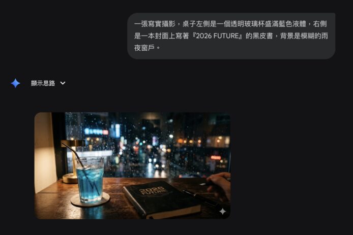 觀察點:Nano Banana 2 輕易地克服了傳統 AI 容易出現的文字拼寫錯誤,那行書名清晰可辨,毫無扭曲。光學細節處理更有專業級相片輸出,左側玻璃杯中的藍色液體產生真實折射效果,甚至連背景雨夜窗戶的微光都細膩地透射在水面。