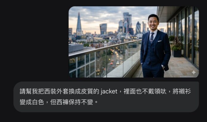 進入影像編輯功能的測試階段時,Nano Banana 2 展現出了如同「數碼手術刀」般的精準度--它能在保持原圖一致性的前提下,進行局部的結構性修改。例如我們上傳了一張穿著正式西裝的照片,隨後下達指令要求將西裝外套換成 Jacket。